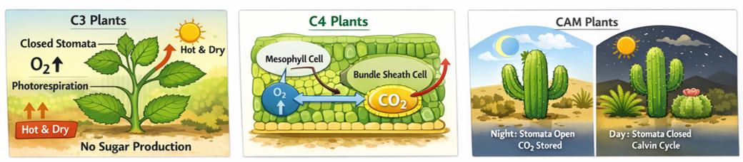 C3 plants, considered the ancestral form of photosynthesis, produce a three-carbon compound as the first stable product. Stomata facilitate gas exchange but close under conditions of heat or drought to conserve water. Limited CO₂ availability can lead to photorespiration, a process in which oxygen is incorporated into the Calvin cycle, reducing photosynthetic efficiency.