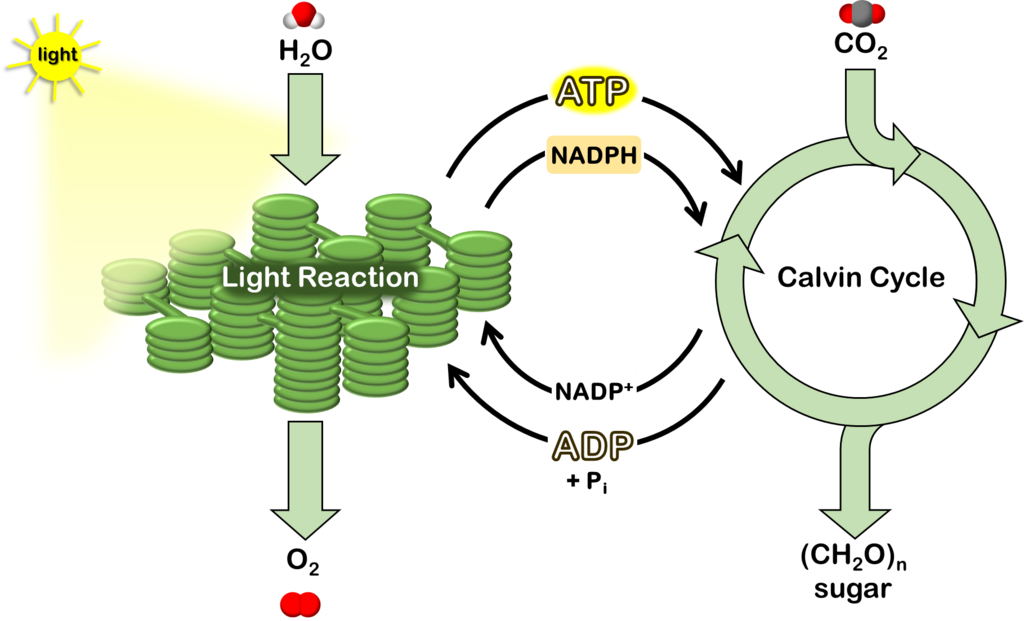Light-dependent reactions (or simply light reactions) occur on the thylakoid membranes and require direct input of light. When photons strike chlorophyll molecules, electrons are excited and transferred through an electron transport chain. Water molecules are split during this process, producing hydrogen ions and oxygen gas. The hydrogen ions combine with NADP⁺ to form NADPH, while the energy released during electron transfer drives the phosphorylation of ADP to ATP through photophosphorylation. The products of light-dependent reactions, ATP and NADPH, serve as the chemical energy carriers required for the light-independent reactions. Oxygen, generated as a byproduct, is released into the atmosphere, contributing to the Earth’s oxygen supply.