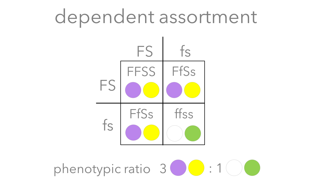 The competing alternative hypotheses predicted different results for the F2 generation. If alleles were linked (as predicted by dependent assortment), the F allele would be physically connected to the S allele in the production of a gamete, and the f allele and s allele would be linked in another gamete. Therefore, in a dihybrid cross the pollen and eggs would either have allele combination F and S (FS) or f and s (fs). No other combinations are possible: neither Fs nor fS. If dependent assortment was supported by this experimental design, the predicted genotypic ratio would be 1FFSS: 2FfSs: 1ffss and the phenotypic ratio (what he could actually observe) would be 3 purple flower/yellow seeded plants to 1 white flower/green seeded plants, which can be generalized as 3 DD (dominant/dominant): 1 RR (recessive/recessive) for other phenotypic combinations under investigation. Dependent assortment would not produce plants with a combination of dominant and recessive phenotypes from a dihybrid cross. In other words, there would be no purple flowered, green seeded plants nor would there be white flowered, yellow seeded plants.