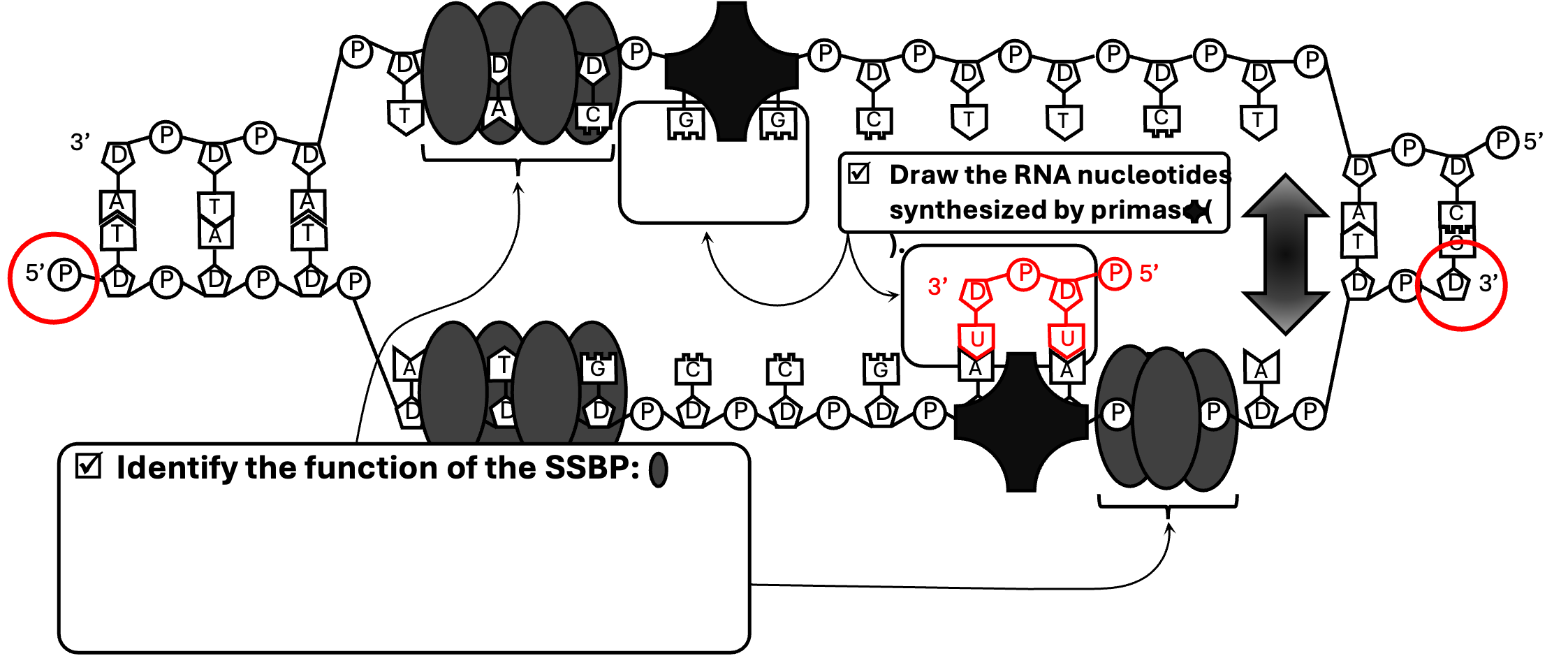 Just as a reminder, you are responsible for completing all of the items in the rounded boxes with the check marks: ☑. In Figure 1, the replication forks are where the active site of DNA Replication is occurring. There are two replication forks per replication bubble.
