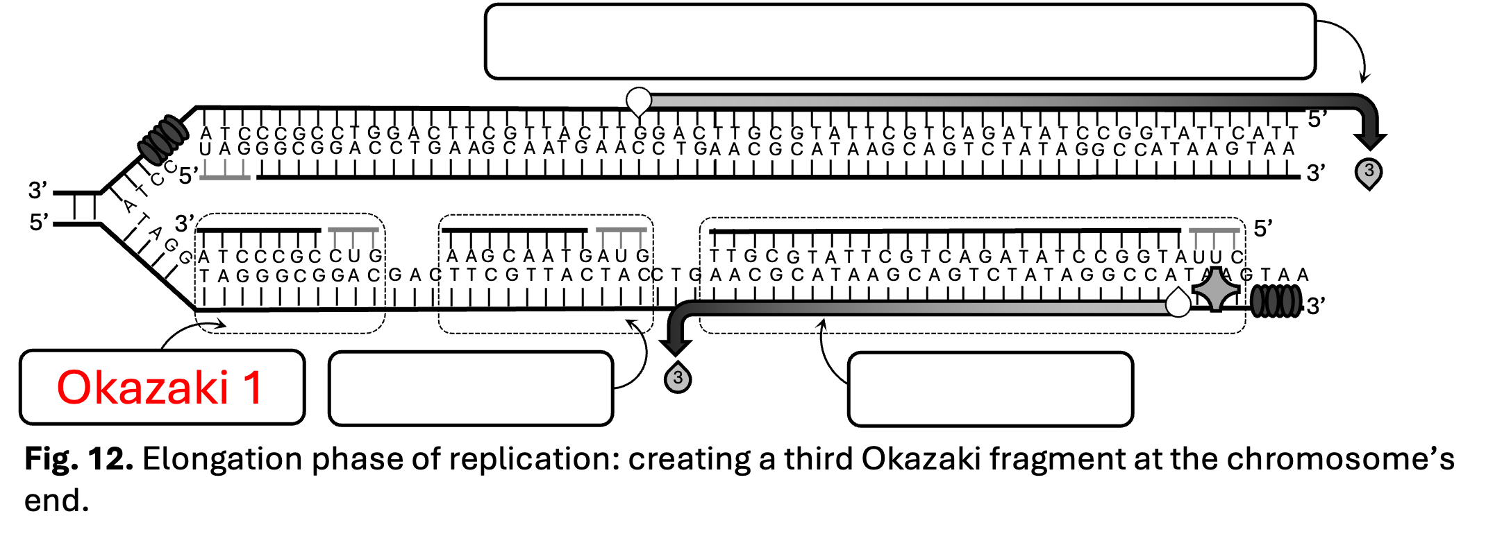 In Figure 12, you are to identify the order of the Okazaki fragments. If you look back at Figures 9 through 11, you will notice that the left most Okazaki fragment was synthesized first. Therefore that would be Okazaki fragment 1.