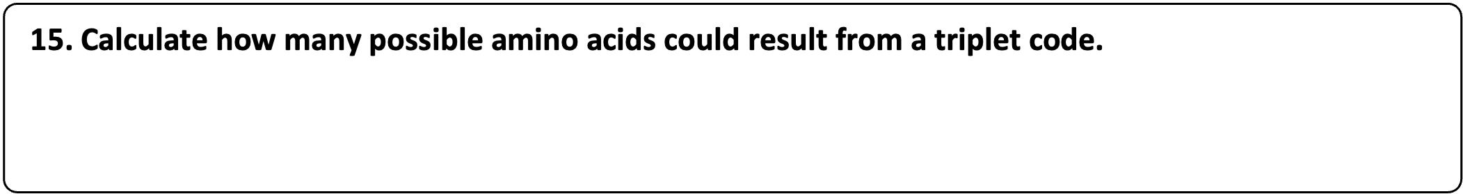 For problem 15, calculate the number of possibilities for the triplet code. A singlet code is 4¹ = 4. That would give us 4 possible combinations. A doublet code would be 4² = 16, or 16 possible combinations. What would a triplet code be?