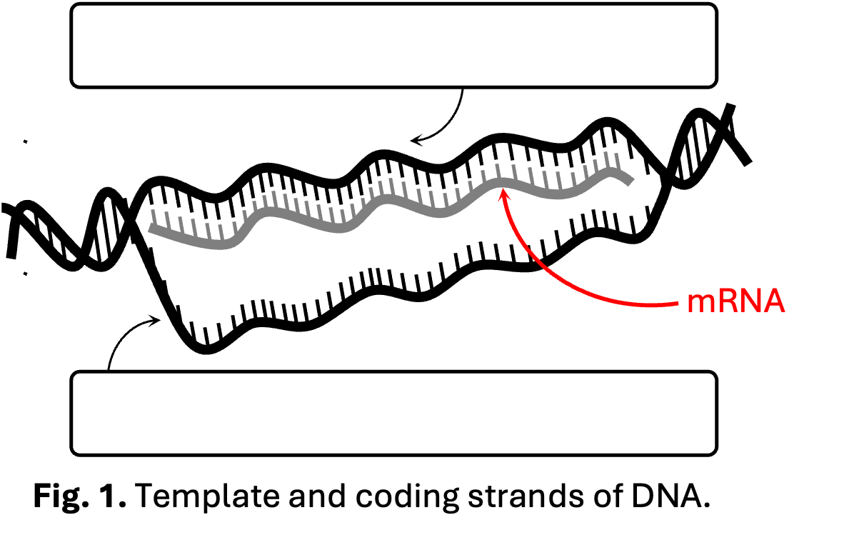 In Figure 1, be sure to label the boxes template and coding. The greyed out strand is the mRNA connecting to the opened DNA.
