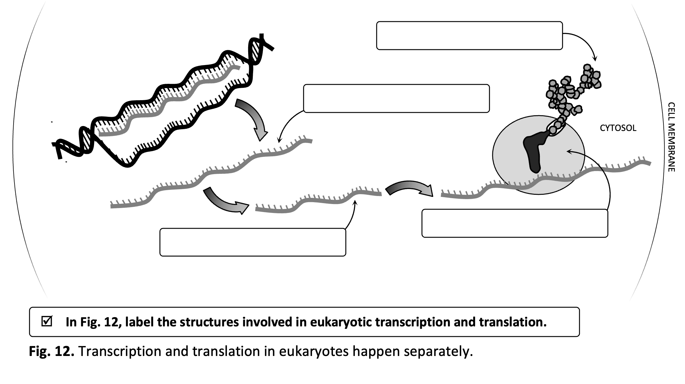 In Figure 12, use the reading to place the following labels in the figure: protein, primary transcript, mature mRNA and ribosome.
