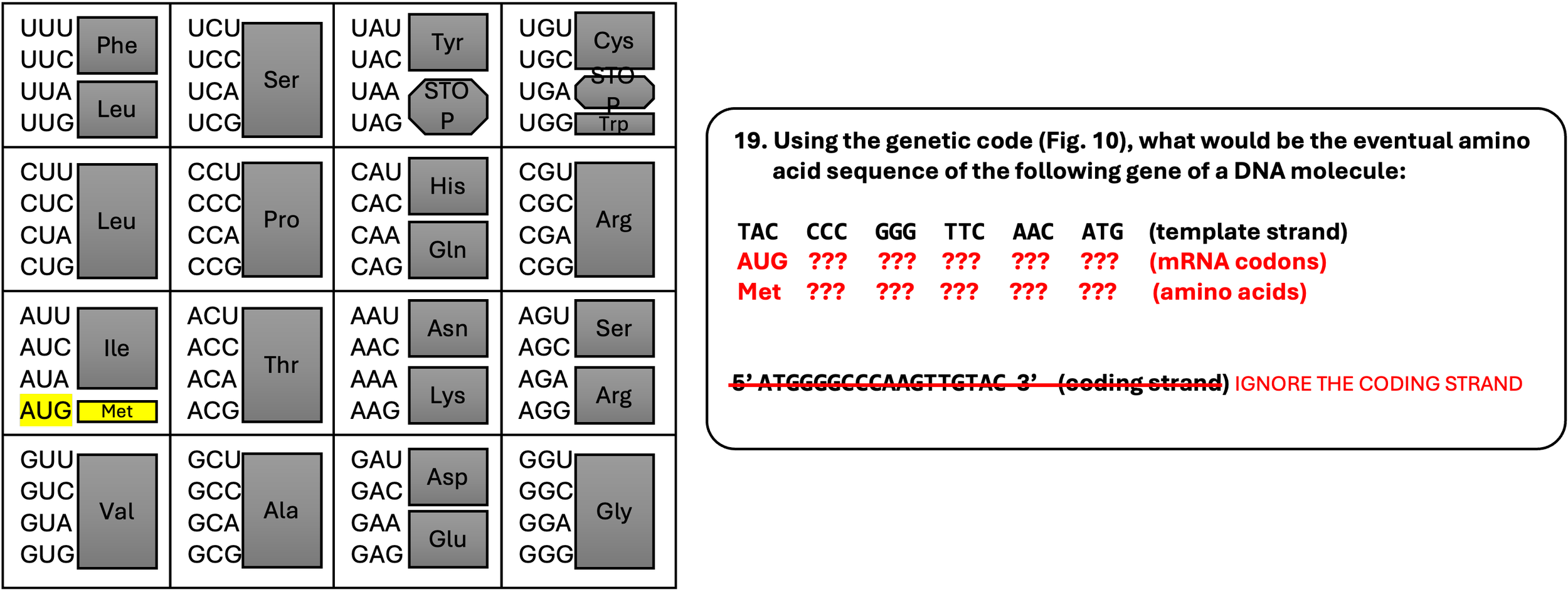 For problem 19, you will predict the amino acid sequence based off of the DNA. Remember the template strand creates the mRNA strand based on complementary base pairing (not the coding strand). The first three bases of the template strand (TAC) would yield the mRNA codon (AUG). Using the amino acid chart, we see that the amino acid would be MET (the start codon). Repeat that for the remainder of the template strand listing out the sequence of amino acids, known as the polypeptide chain.