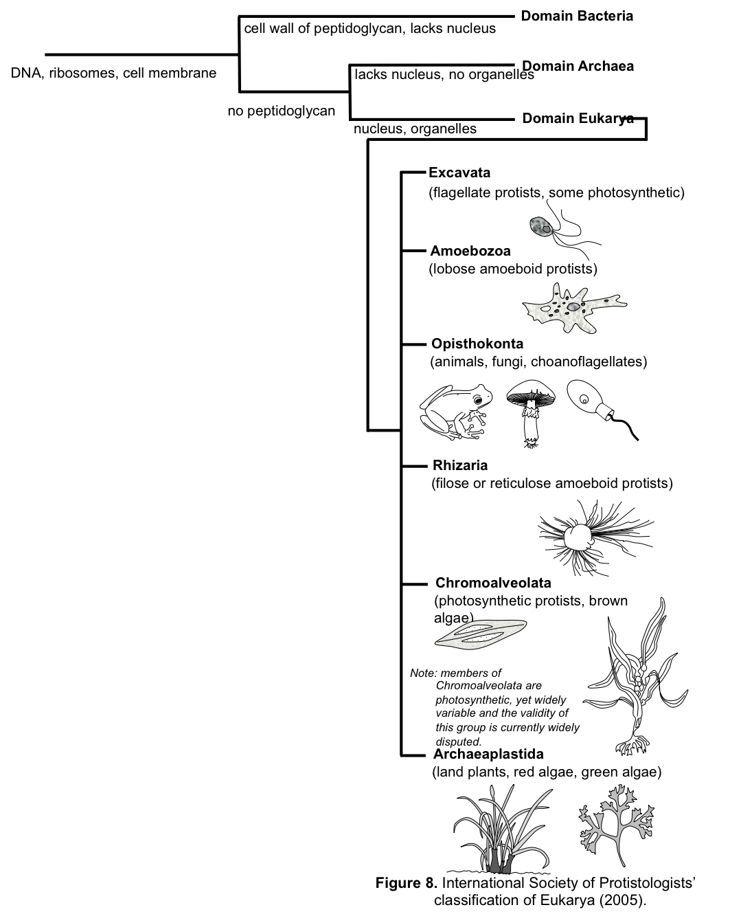 In 2005, the International Society of Protistologists divided Eukarya into six “supergroups” based on genetic analyses (Fig. 8). Animals and fungi were included into the supergroup, Opisthokonta, alongside their suspected unicellular (and sometimes colonial) cousin the choanoflagellate. Amoebozoid protists fall into two supergroups. Traditional amoebas with lobose pseudopodia form the Amoebozoa, while amoeboids with either filose or reticulose pseudopodia form Rhizaria.
